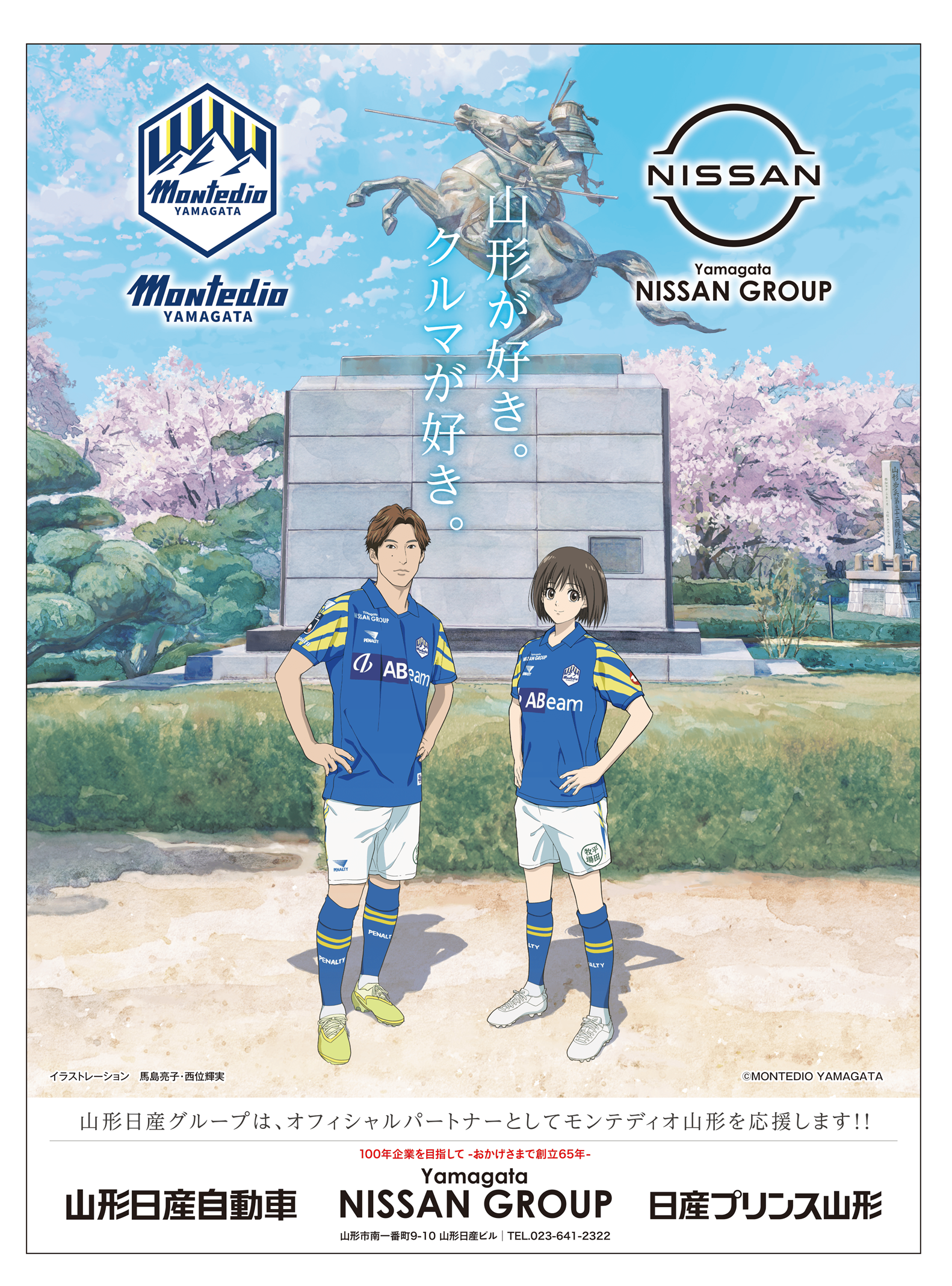 2025年オフィシャルパートナーとして応援しておりますモンテディオ山形さんとのコラボ。サポーターの皆さんをバックに選手の皆さんとヒカリを描いていただきました。